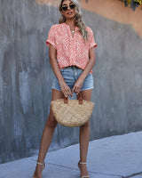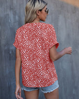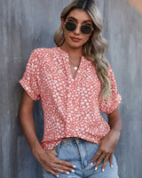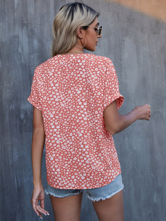 Tämä kauniisti kukkakuvioitu T-paita hurmaa yksinkertaisuudellaan ja eleganssillaan. Yhdistä shortsien tai farkkujen kanssa ja nauti kesän rennosta tyylistä, joka on samalla sekä tyylikäs että mukava.