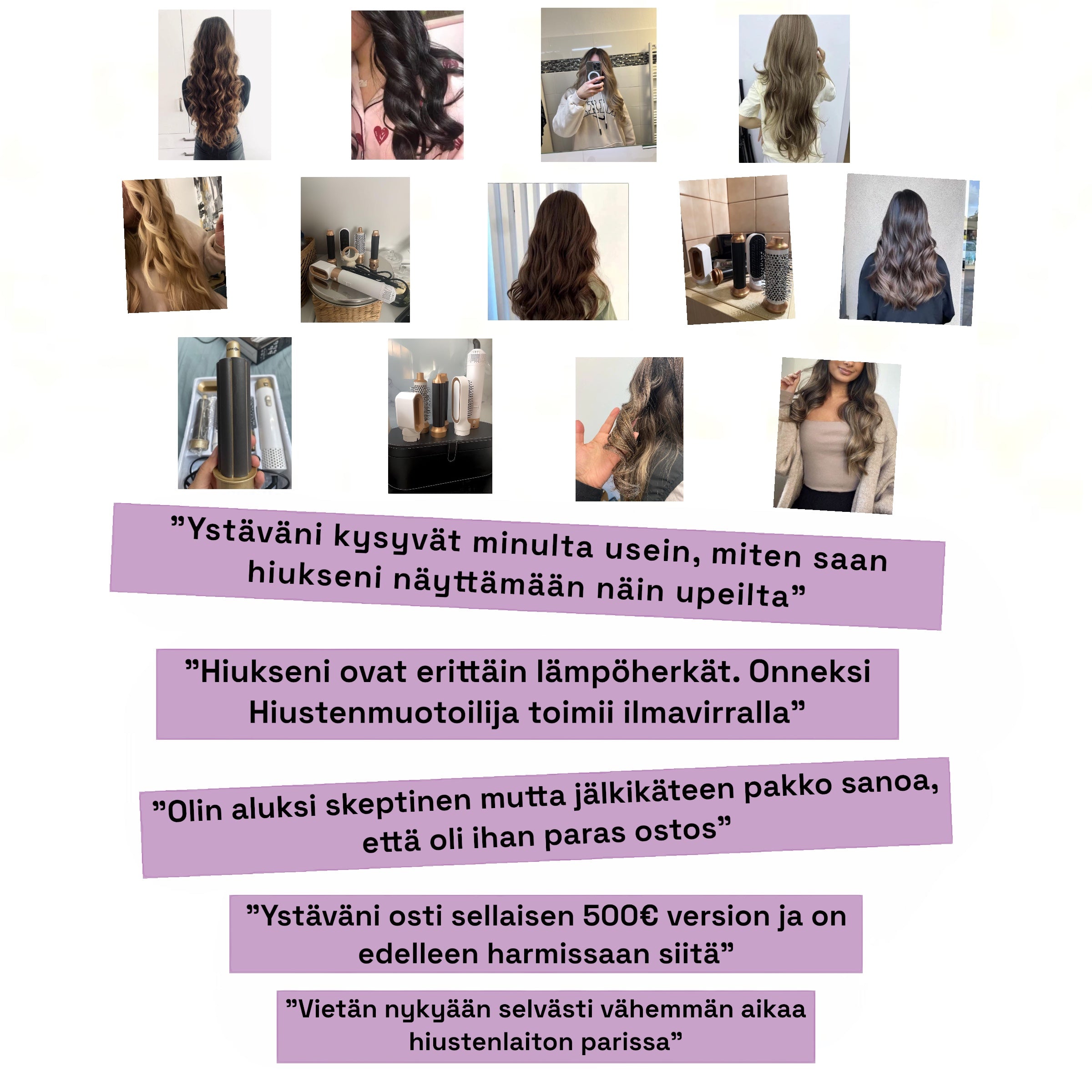 Hiustenmuotoilija eroaa perinteisistä muotoilulaitteista innovatiivisen ilmateknologiansa ansiosta. Se käyttää hellävaraisia lämpötiloja 90-100 astetta, jotta tarkka ja hellävarainen stailaus voidaan taata. Tämä menetelmä sopii täydellisesti herkille hiuksille, luo vaikuttavia kiharoita, jotka kestävät koko päivän, ja tarvitsee vain murto-osan perinteisten työkalujen lämmöstä.