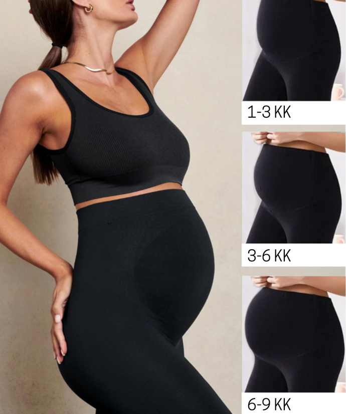 Äitiysleggingsit, jotka mukautuvat vatsan kasvuun ja tuovat lempeää tukea selälle.