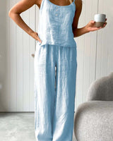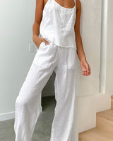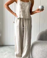 Tämä pellavasekoitteinen setti on valmistettu puuvillan ja pellavan sekoituksesta, tarjoten äärimmäistä mukavuutta ja hengittävyyttä. Se on hellävarainen iholle ja sen ohut materiaali tekee siitä kevyen ja helpon käyttää.